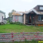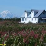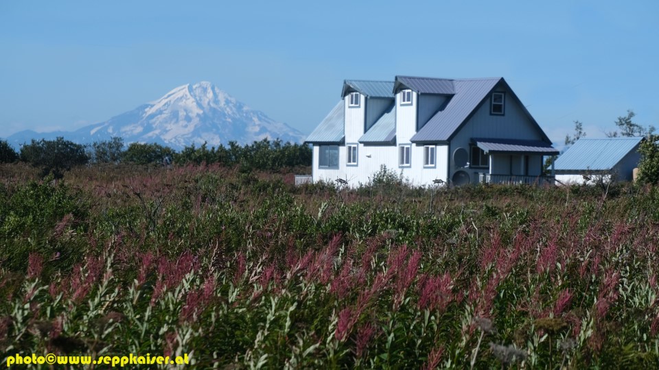 Alaska – Haus in Ninilchik mit dem 3108 m hohen Vulkan Redoubt im Hintergrund