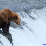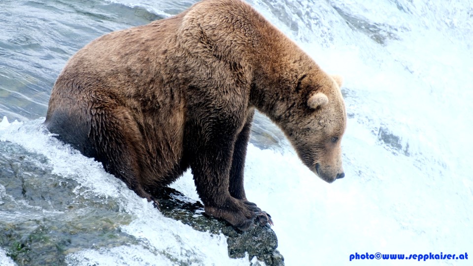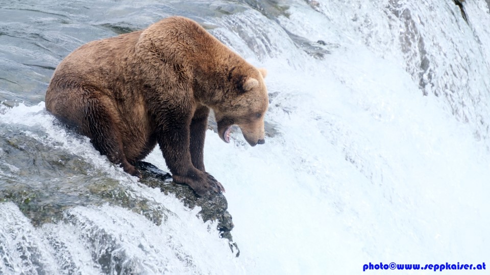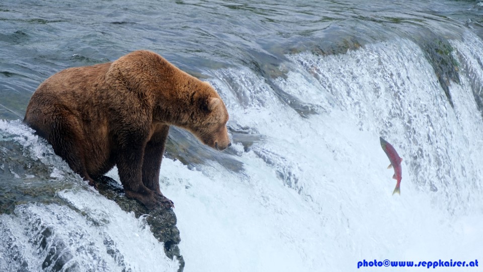 Alaska – Braunbär wartet auf springede Lachse an den Brooks Falls im Katmai NP